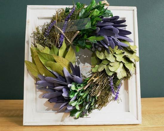 ドライ素材で作られた、グリーンと紫が大人っぽいリースです。