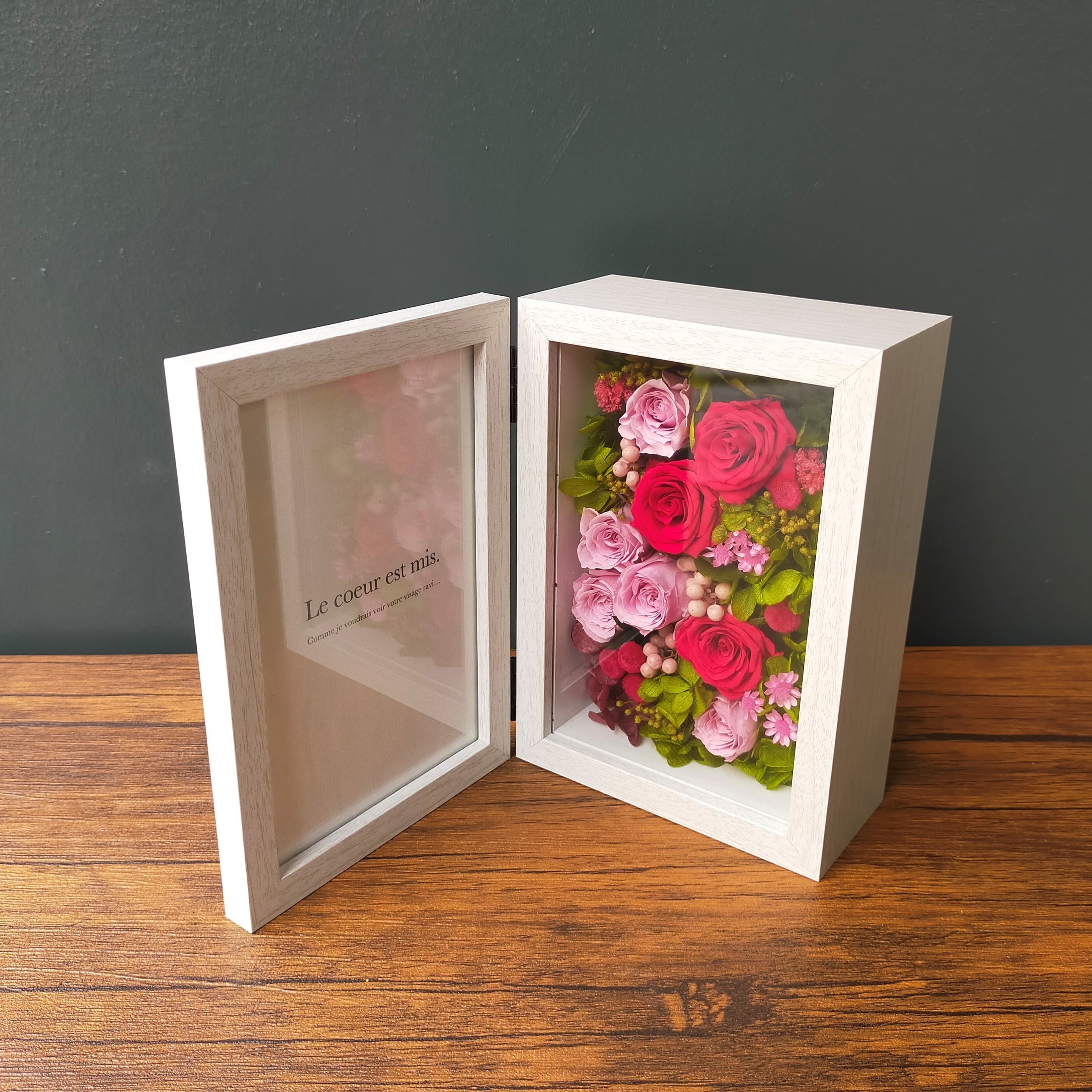 片面にプリザーブドフラワーがアレンジされており、もう片面にはハガキサイズの写真を入れて飾ることが出来ます。