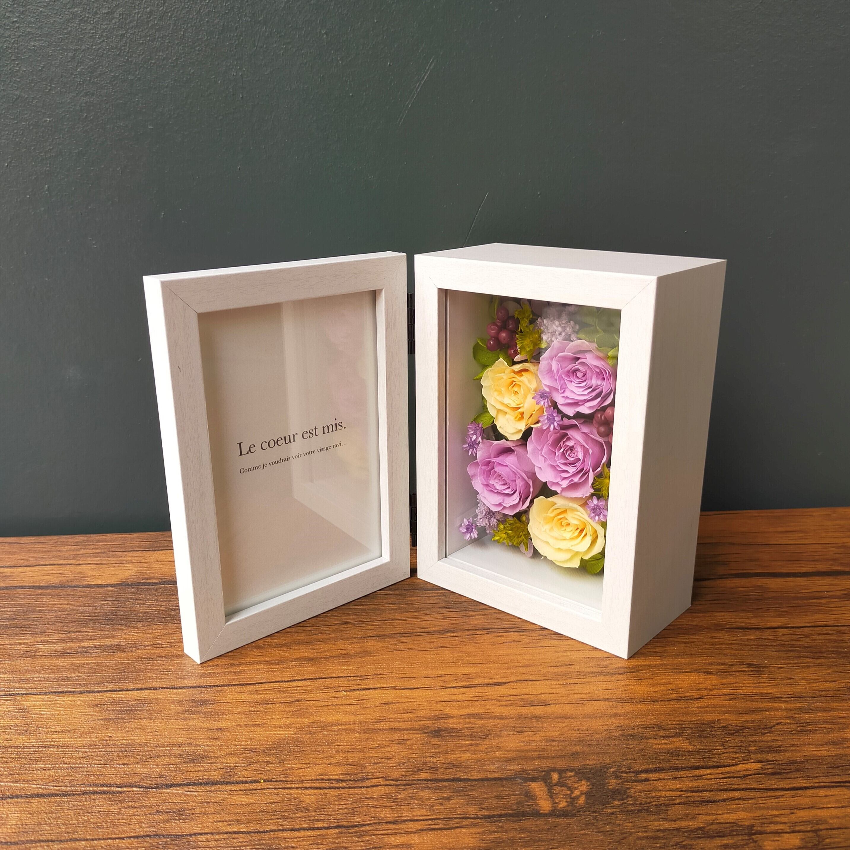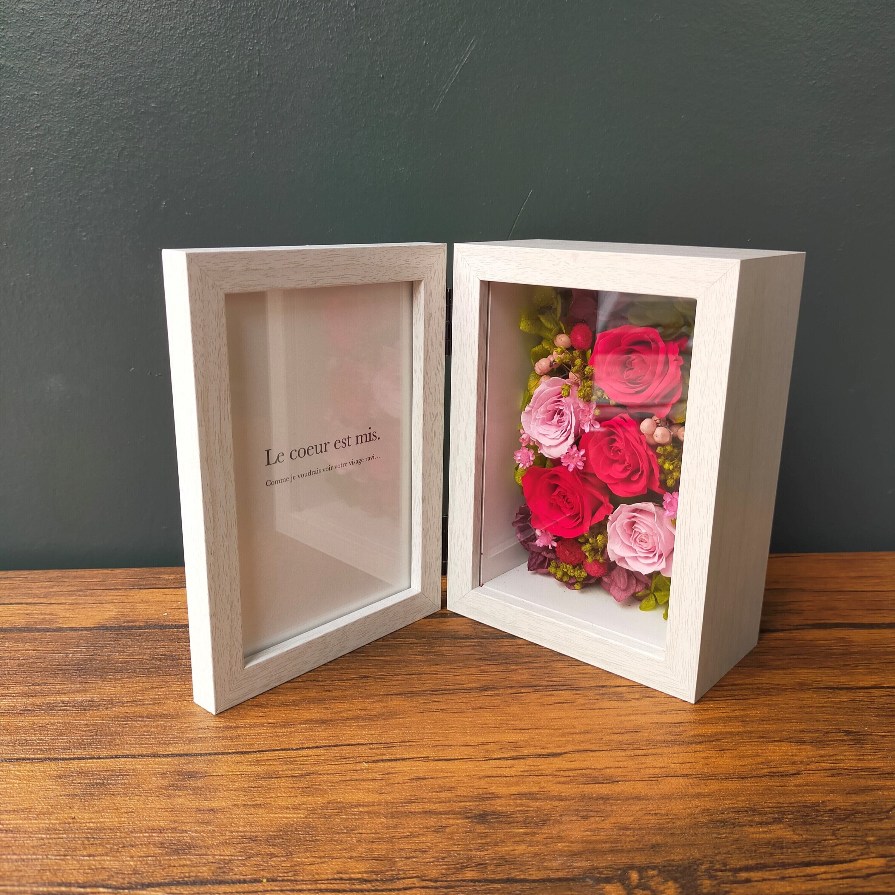 片面にプリザーブドフラワーがアレンジされており、もう片面には写真を入れて飾ることが出来ます。