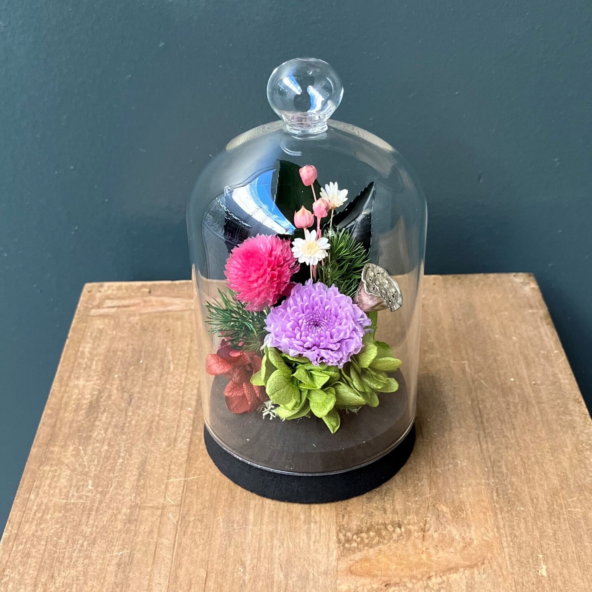 ガラスドームの中にプリザーブドフラワーがアレンジされています。