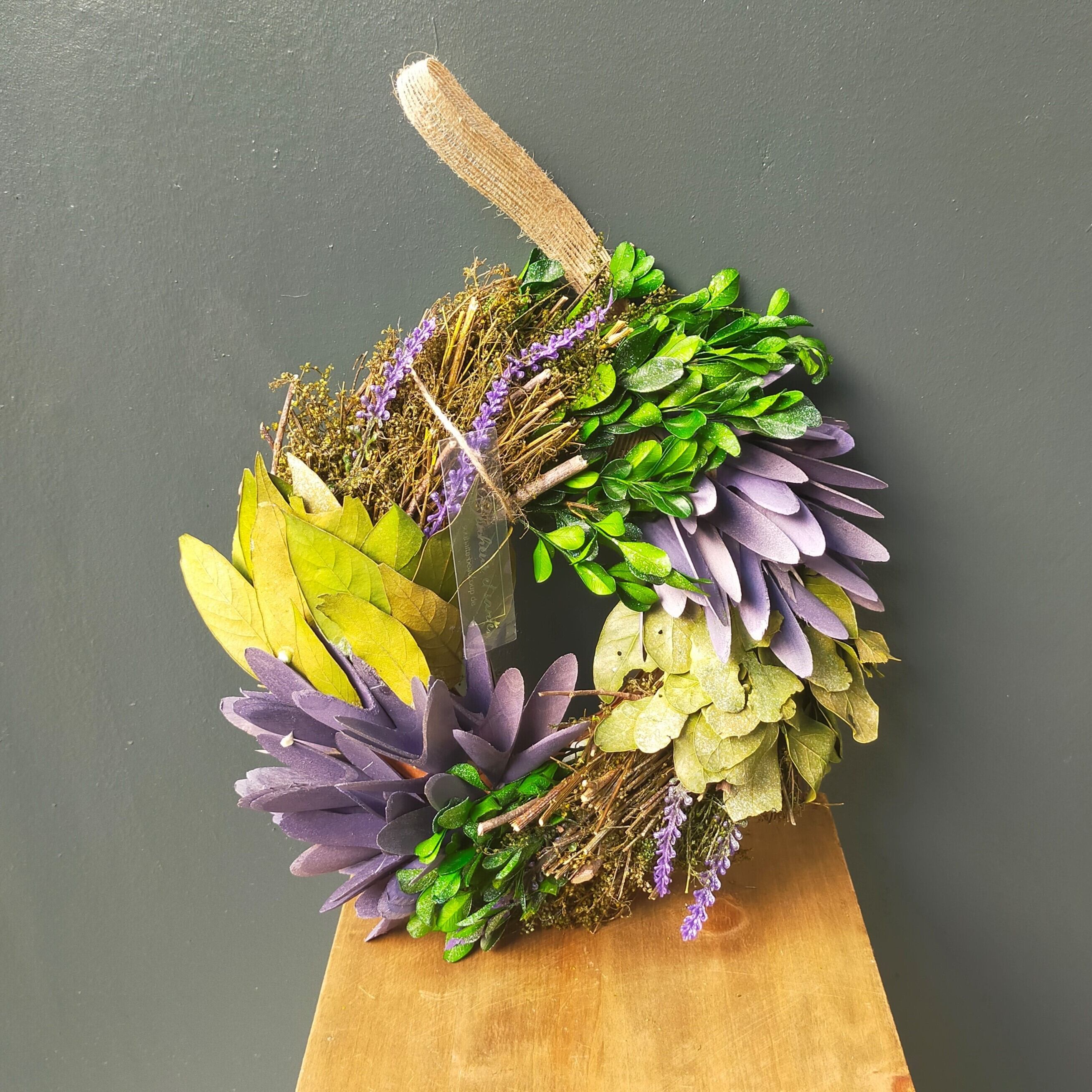 ドライ素材で出来た、シックな色味が大人っぽい印象のリースです。