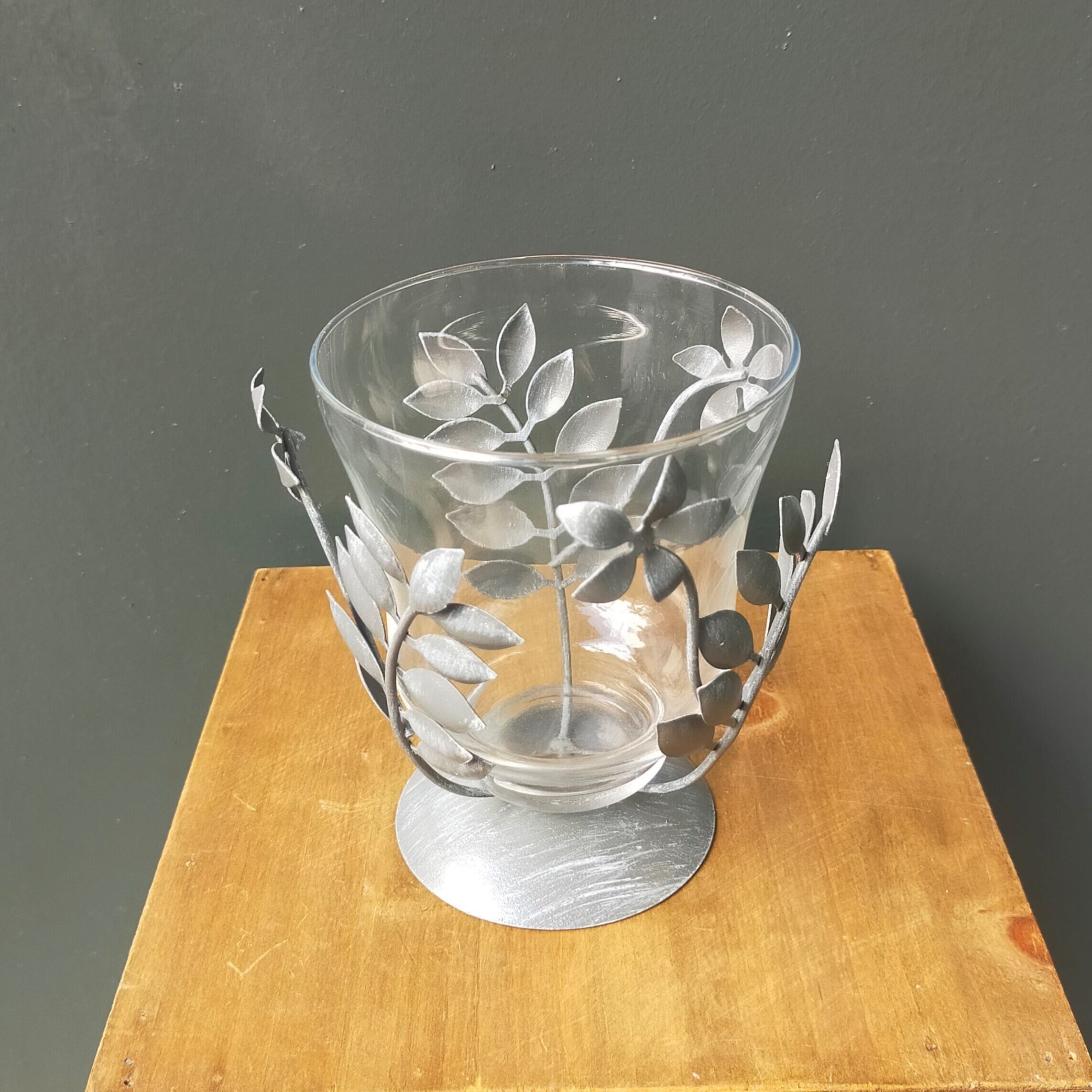 花と葉のモチーフのアルミ素材で出来たフレームに、ガラスのカップをセットして使います。